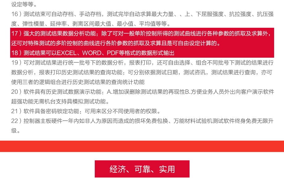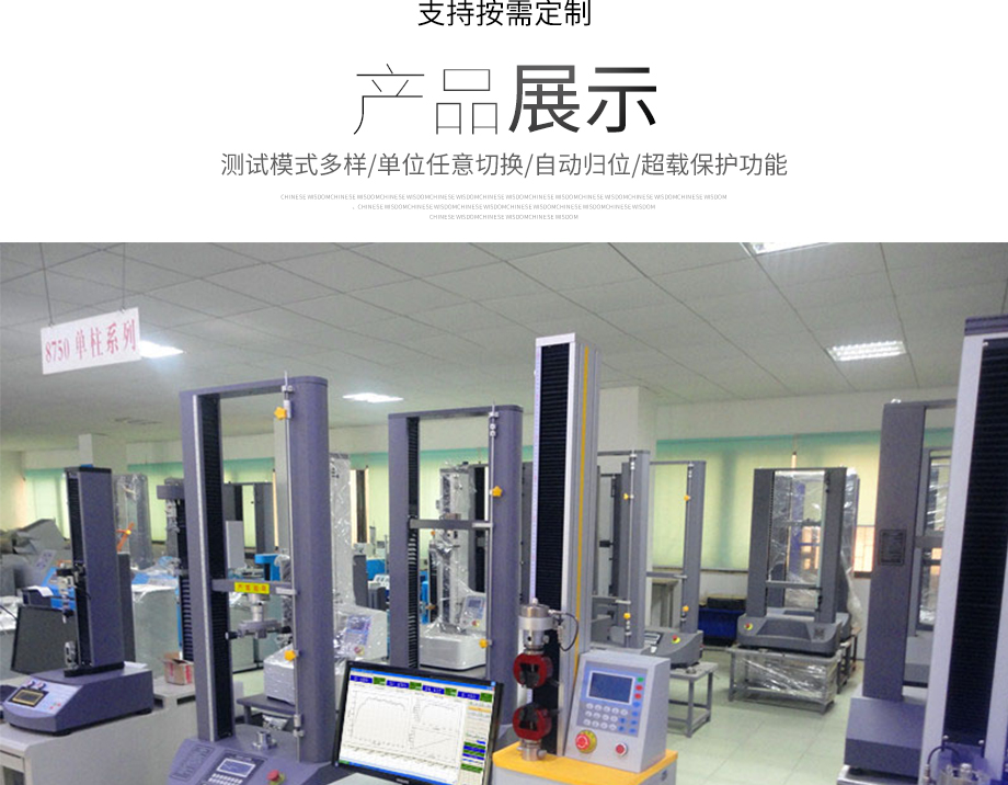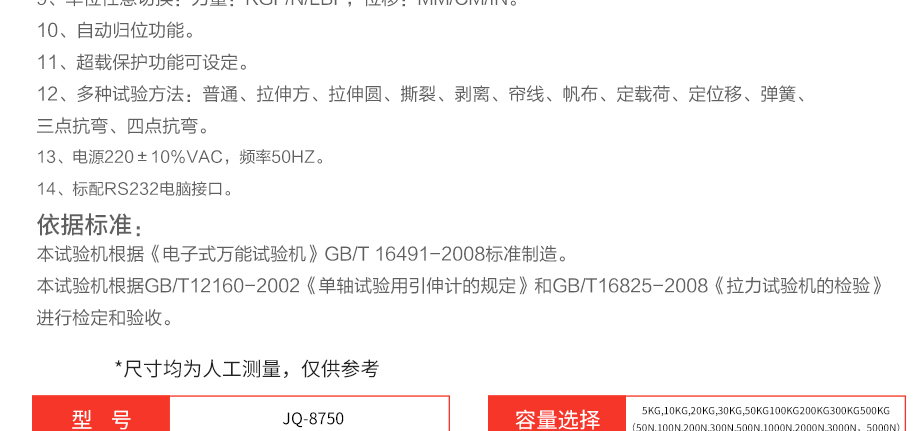 產(chǎn)品型號:JQ-8750 品牌:劍 喬 用途:本系列機(jī)廣泛用于各類五金、金屬、塑膠、橡膠料、紙品、包裝、鞋類、皮革、服裝、紡織、建材、絕緣體、電線、電纜、端子等各類材料。測試其拉伸、撕裂、剝離、抗壓、彎曲、抗剪切、定